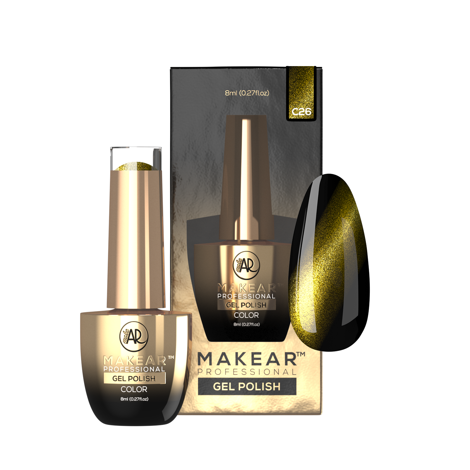 Trajni lak C26 CAT EYE MakeAR, 8ml – Kolekcija najprodavanijih lakova s ​​efektom mačjeg oka. Magnetski lakovi u oduševit će vas od prve upotrebe. Namijenjeni su za profesionalnu uporabu. Ostavljaju visoki sjaj i iznimno su izdržljivi. Efekt mačjeg oka postiže se primjenom posebnog magneta. Prije samog nanošenja trajni lak je potrebno dobro protresti jer se čestice slegnu na dno.